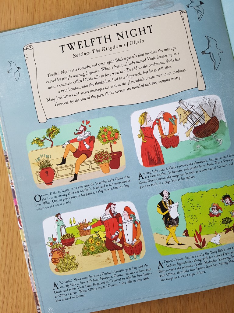 In this book, there are ten of Shakespeare’s most famous plays retold (As You Like It, Julius Caesar, Twelfth Night, Macbeth, The Tempest, Much Ado About Nothing, Antony and Cleopatra, A Midsummer Night’s Dream, Romeo and Juliet, and Hamlet), with each having a double page spread, split up almost like a comic book with multiple illustrations telling the tale, followed by a double page illustration to hunt for selected characters – and Mr Shakespeare himself! The plays are of course, super simplified, but each introduces the setting, the basic plot and all the main characters beautifully, despite being reduced to a mere two pages.