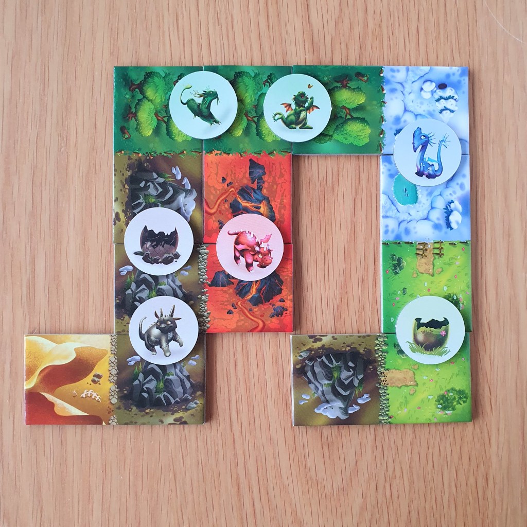 Each player takes a starting domino tile, and 4 “exploration” tiles are laid out in the centre face up. The person holding the mother dragon (for the first round, this is the youngest player) gets first pick of the tiles, and chooses one that will match a landscape on his or her starter domino. After placing it, they then chose a dragon egg of that type to place on the match – hopefully that egg has a dragon on the back, but if they find themselves with only a broken shell, that player gets possession of the mother dragon! Play then continues clockwise, with each player choosing and placing a domino tile, and collecting their required eggs. Once each player has had a turn, any remaining tiles are removed from the “exploration” pile, and are replaced by 4 new ones, ready to start a new round.