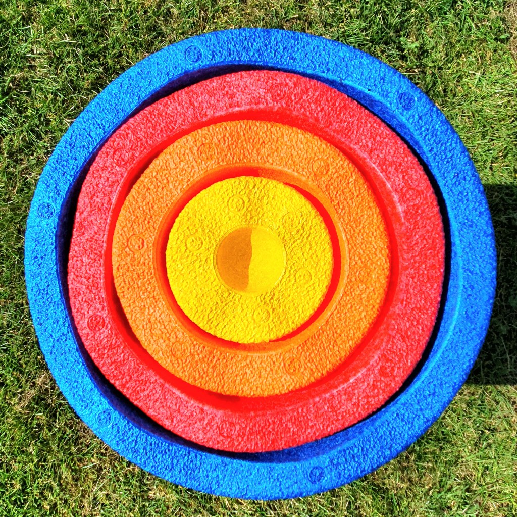 Stapelstein Inside are the Russian dolls of the Stapelstein world – a set comprises of two large, two medium and two small Stapelsteins, and the different sizes cleverly nest inside each other. And half a set even nests inside a single “classic” Stapelstein, which extends the set further! The wavy edge means they interlock nicely into a neat ball for storage purposes – just don’t try and throw it, as it’ll fall apart instantly! The differing sizes mean they lend themselves to stacking, nesting, and open ended play beautifully, but they’re also good for being stepping stones too – though you’ll need tiny feet for the smallest size!