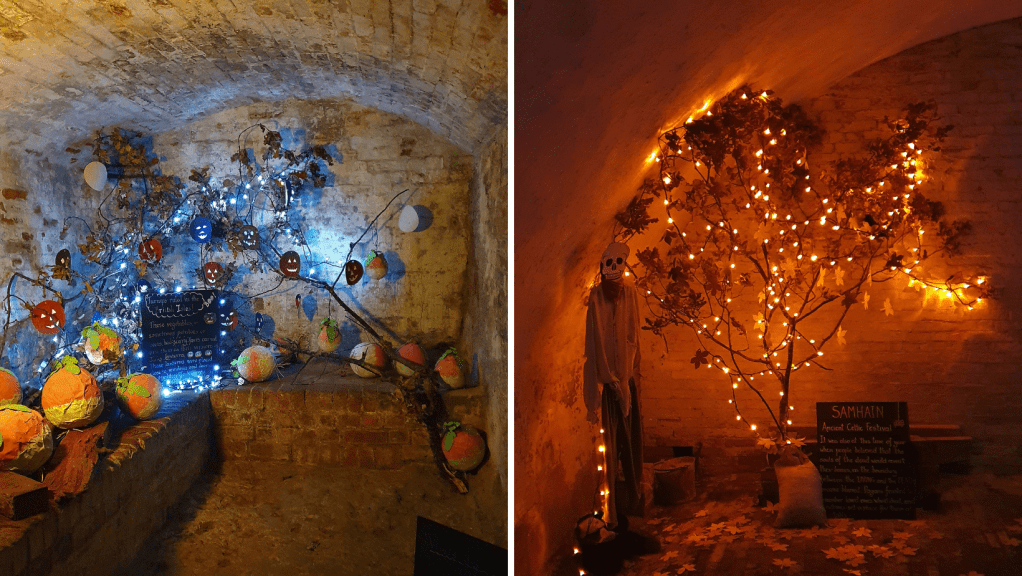 The biggest part last year (2022), was a Halloween trail through the tunnels underneath the house, with lots of coloured lights, and displays with little bits of information about celebrating Halloween in the past. It was far more pretty than spooky, though the damp gloominess of the tunnels did lend a distinct Halloween vibe to it all! Plus, it was a fab way to see parts of the house that are not usually open to the public!